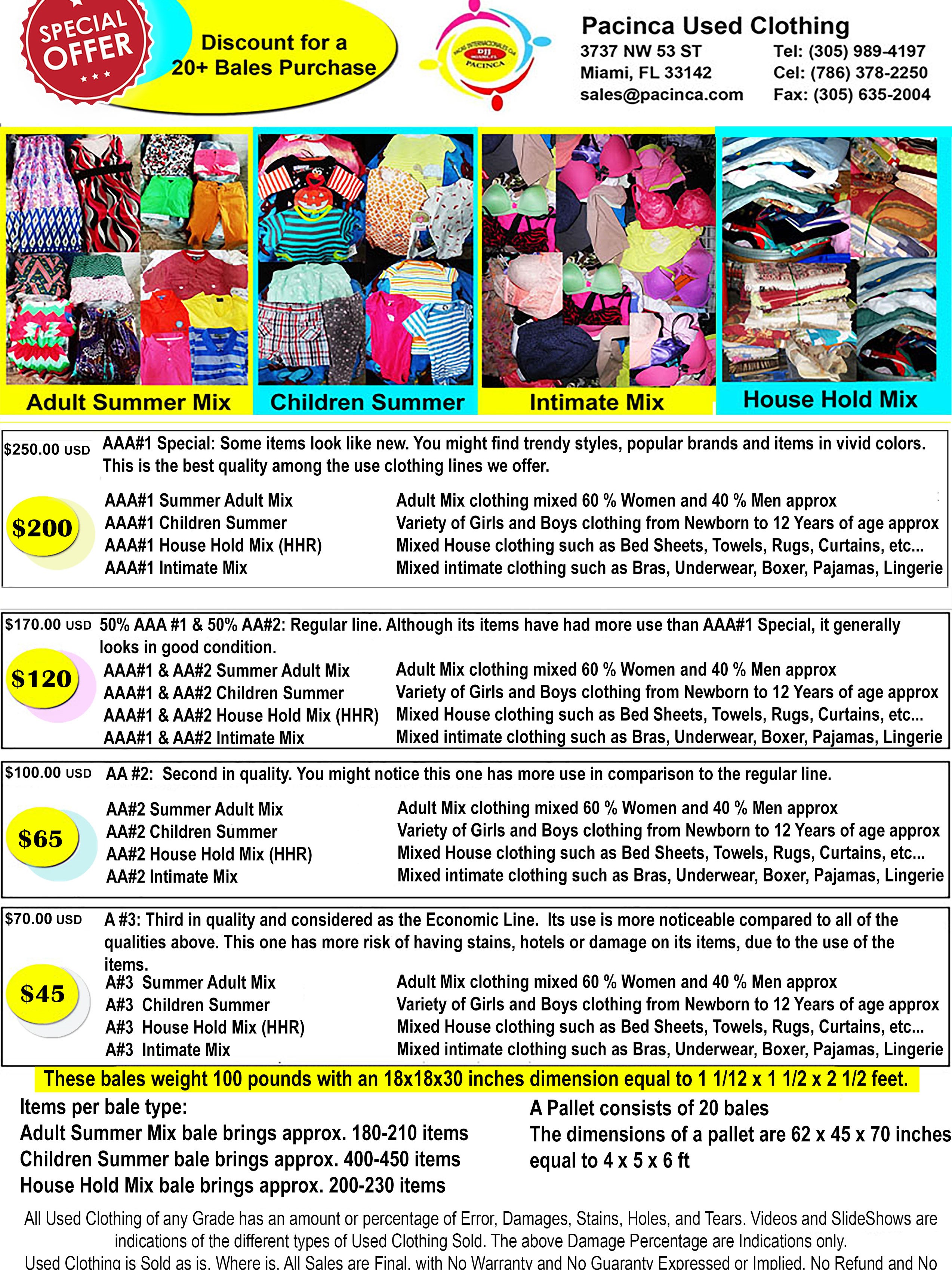 All used clothing of any grade has a percentage of error, stain, holes and or tear; normal for this type of business. Our percentage is approximately 6%. All sales are final and the clothes are sold as is, no warranty and no guaranty expressed or implied, no refund and no exchange. Once an order is placed we can’t stop grading or the selection process this is why the deposit is not refundable or transferable.
